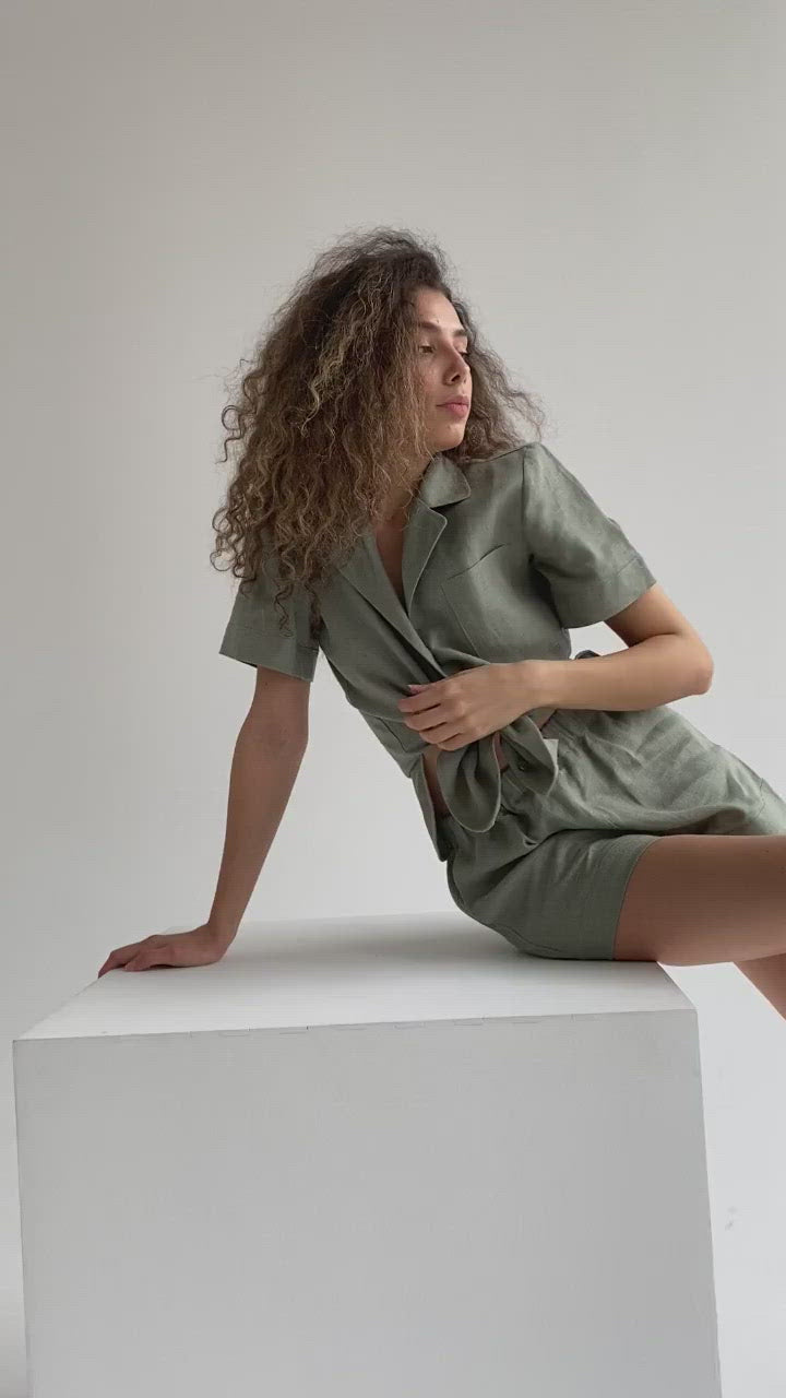 Легкий льняний костюм із шортами та сорочкою з коротким рукавом на ґудзиках.